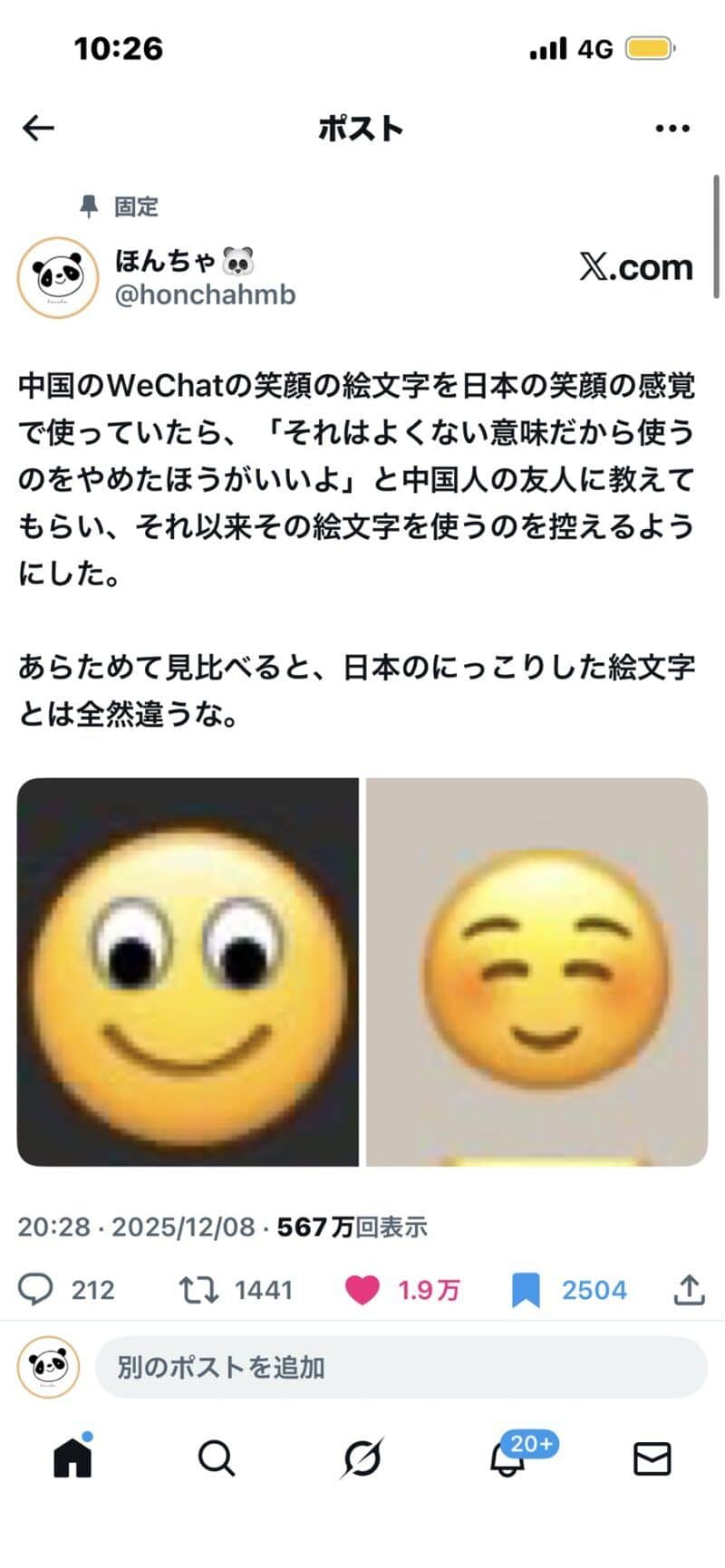 日本だと、この絵文字って「優しい」「ほんわか」みたいな温かいイメージですよね。でも中国では、目が閉じている笑顔って、どこか冷たい、距離を置いた印象になるんです。